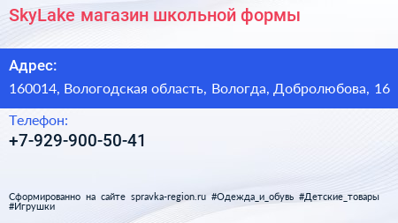 SkyLake, магазин школьной формы по адресу 160014, Вологодская область, Вологда, Добролюбова, 16 в дальнейшем Организация, размещена в следующих категориях:
