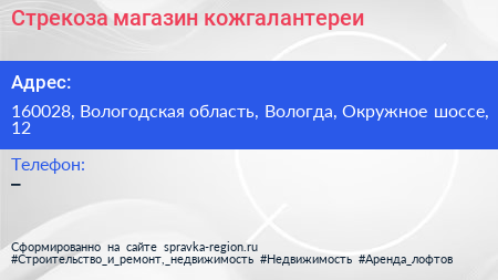 Стрекоза, магазин кожгалантереи по адресу 160028, Вологодская область, Вологда, Окружное шоссе, 12 в дальнейшем Организация, размещена в следующих категориях: