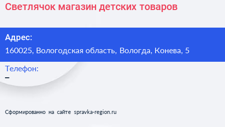 Светлячок, магазин детских товаров по адресу 160025, Вологодская область, Вологда, Конева, 5 в дальнейшем Организация, размещена в следующих категориях: