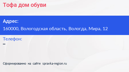 Тофа, дом обуви по адресу 160000, Вологодская область, Вологда, Мира, 12 в дальнейшем Организация, размещена в следующих категориях: