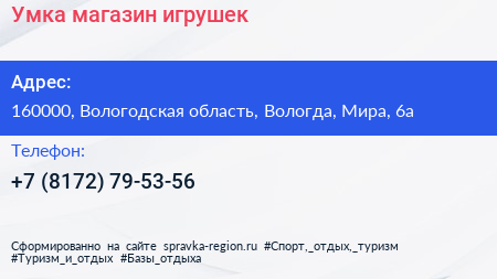 Умка, магазин игрушек по адресу 160000, Вологодская область, Вологда, Мира, 6а в дальнейшем Организация, размещена в следующих категориях: