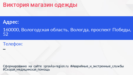 Виктория, магазин одежды по адресу 160000, Вологодская область, Вологда, проспект Победы, 52 в дальнейшем Организация, размещена в следующих категориях: