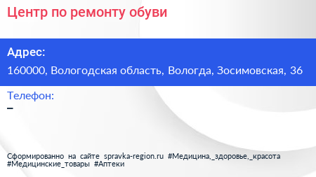 Центр по ремонту обуви по адресу 160000, Вологодская область, Вологда, Зосимовская, 36 в дальнейшем Организация, размещена в следующих категориях: