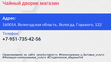 Чайный дворик, магазин по адресу 160014, Вологодская область, Вологда, Горького, 122 в дальнейшем Организация, размещена в следующих категориях: