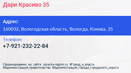 Дари Красиво 35 по адресу 160032, Вологодская область, Вологда, Конева, 35 в дальнейшем Организация, размещена в следующих категориях:
