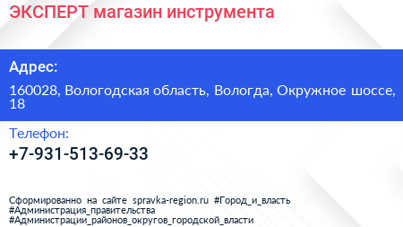 ЭКСПЕРТ, магазин инструмента по адресу 160028, Вологодская область, Вологда, Окружное шоссе, 18 в дальнейшем Организация, размещена в следующих категориях: