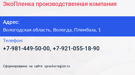 ЭкоПленка, производственная компания по адресу Вологодская область, Вологда, Плембаза, 1 в дальнейшем Организация, размещена в следующих категориях: