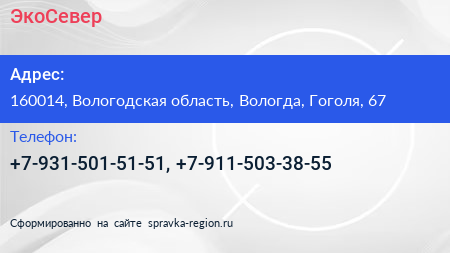 ЭкоСевер по адресу 160014, Вологодская область, Вологда, Гоголя, 67 в дальнейшем Организация, размещена в следующих категориях:
