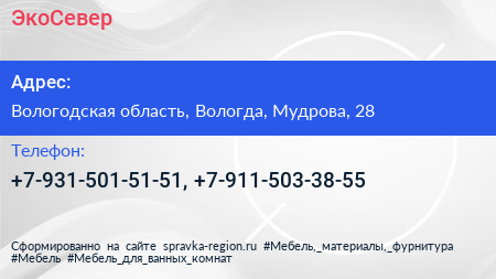 ЭкоСевер по адресу Вологодская область, Вологда, Мудрова, 28 в дальнейшем Организация, размещена в следующих категориях: