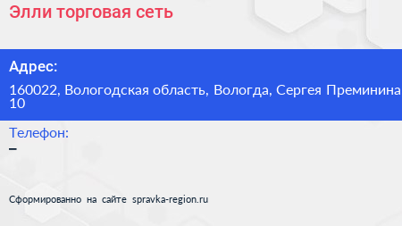 Элли, торговая сеть по адресу 160022, Вологодская область, Вологда, Сергея Преминина, 10 в дальнейшем Организация, размещена в следующих категориях: