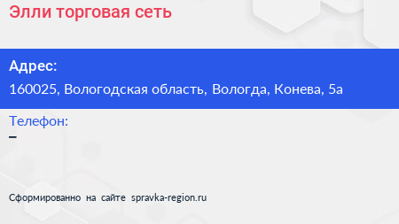 Элли, торговая сеть по адресу 160025, Вологодская область, Вологда, Конева, 5а в дальнейшем Организация, размещена в следующих категориях:
