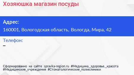 Хозяюшка, магазин посуды по адресу 160001, Вологодская область, Вологда, Мира, 42 в дальнейшем Организация, размещена в следующих категориях: