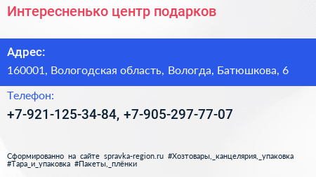 Интересненько, центр подарков по адресу 160001, Вологодская область, Вологда, Батюшкова, 6 в дальнейшем Организация, размещена в следующих категориях:
