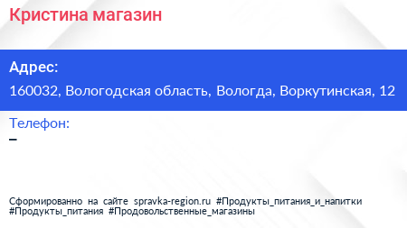 Кристина, магазин по адресу 160032, Вологодская область, Вологда, Воркутинская, 12 в дальнейшем Организация, размещена в следующих категориях: