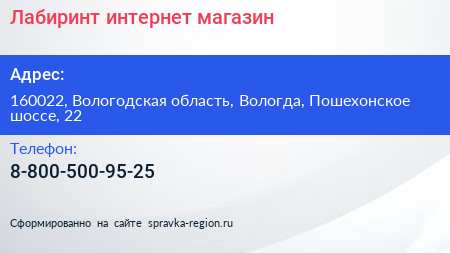 Лабиринт, интернет-магазин по адресу 160022, Вологодская область, Вологда, Пошехонское шоссе, 22 в дальнейшем Организация, размещена в следующих категориях:
