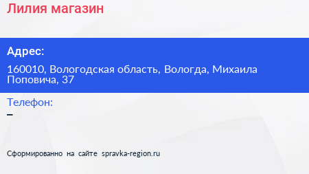 Лилия, магазин по адресу 160010, Вологодская область, Вологда, Михаила Поповича, 37 в дальнейшем Организация, размещена в следующих категориях: