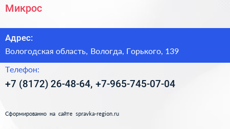 Микрос по адресу Вологодская область, Вологда, Горького, 139 в дальнейшем Организация, размещена в следующих категориях: