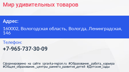 Мир удивительных товаров по адресу 160002, Вологодская область, Вологда, Ленинградская, 146 в дальнейшем Организация, размещена в следующих категориях: