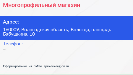 Многопрофильный магазин по адресу 160009, Вологодская область, Вологда, площадь Бабушкина, 10 в дальнейшем Организация, размещена в следующих категориях: