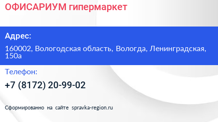 ОФИСАРИУМ, гипермаркет по адресу 160002, Вологодская область, Вологда, Ленинградская, 150а в дальнейшем Организация, размещена в следующих категориях: