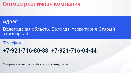 Оптово-розничная компания по адресу Вологодская область, Вологда, территория Старый аэропорт, 8 в дальнейшем Организация, размещена в следующих категориях: