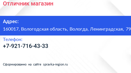 Отличник, магазин по адресу 160017, Вологодская область, Вологда, Ленинградская, 79 в дальнейшем Организация, размещена в следующих категориях: