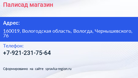 Палисад, магазин по адресу 160019, Вологодская область, Вологда, Чернышевского, 76 в дальнейшем Организация, размещена в следующих категориях: