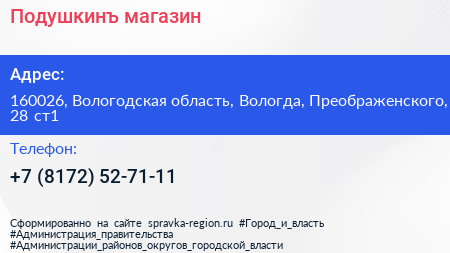Подушкинъ, магазин по адресу 160026, Вологодская область, Вологда, Преображенского, 28 ст1 в дальнейшем Организация, размещена в следующих категориях: