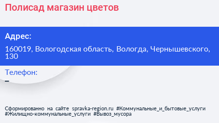 Полисад, магазин цветов по адресу 160019, Вологодская область, Вологда, Чернышевского, 130 в дальнейшем Организация, размещена в следующих категориях: