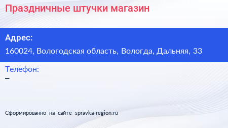 Праздничные штучки, магазин по адресу 160024, Вологодская область, Вологда, Дальняя, 33 в дальнейшем Организация, размещена в следующих категориях: