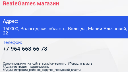 ReateGames, магазин по адресу 160000, Вологодская область, Вологда, Марии Ульяновой, 22 в дальнейшем Организация, размещена в следующих категориях: