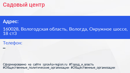 Садовый центр по адресу 160028, Вологодская область, Вологда, Окружное шоссе, 18 ст3 в дальнейшем Организация, размещена в следующих категориях: