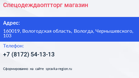 Спецодеждаоптторг, магазин по адресу 160019, Вологодская область, Вологда, Чернышевского, 103 в дальнейшем Организация, размещена в следующих категориях: