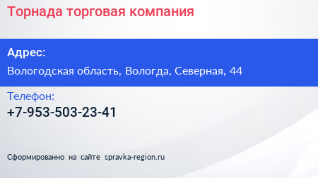 Торнада, торговая компания по адресу Вологодская область, Вологда, Северная, 44 в дальнейшем Организация, размещена в следующих категориях: