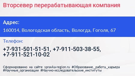 Вторсевер, перерабатывающая компания по адресу 160014, Вологодская область, Вологда, Гоголя, 67 в дальнейшем Организация, размещена в следующих категориях: