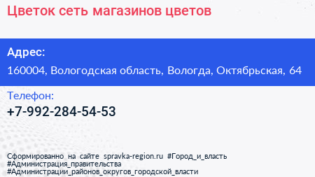 Цветок, сеть магазинов цветов по адресу 160004, Вологодская область, Вологда, Октябрьская, 64 в дальнейшем Организация, размещена в следующих категориях:
