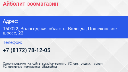 Айболит, зоомагазин по адресу 160022, Вологодская область, Вологда, Пошехонское шоссе, 22 в дальнейшем Организация, размещена в следующих категориях: