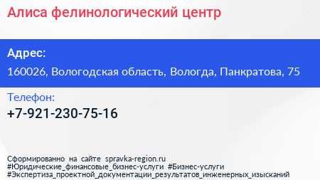 Алиса, фелинологический центр по адресу 160026, Вологодская область, Вологда, Панкратова, 75 в дальнейшем Организация, размещена в следующих категориях: