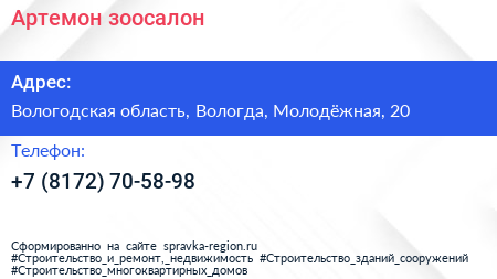 Артемон, зоосалон по адресу Вологодская область, Вологда, Молодёжная, 20 в дальнейшем Организация, размещена в следующих категориях: