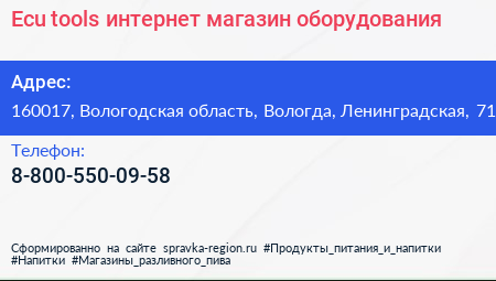 Ecu tools, интернет магазин оборудования по адресу 160017, Вологодская область, Вологда, Ленинградская, 71 в дальнейшем Организация, размещена в следующих категориях: