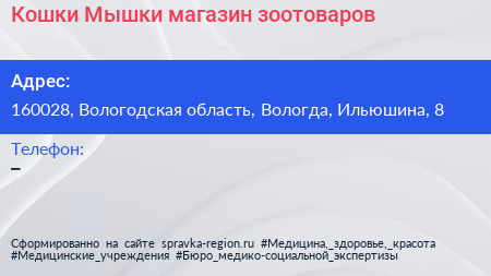 Кошки-Мышки, магазин зоотоваров по адресу 160028, Вологодская область, Вологда, Ильюшина, 8 в дальнейшем Организация, размещена в следующих категориях: