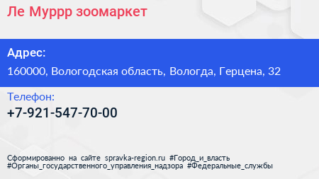 Ле`Муррр, зоомаркет по адресу 160000, Вологодская область, Вологда, Герцена, 32 в дальнейшем Организация, размещена в следующих категориях: