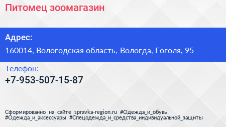 Питомец, зоомагазин по адресу 160014, Вологодская область, Вологда, Гоголя, 95 в дальнейшем Организация, размещена в следующих категориях: