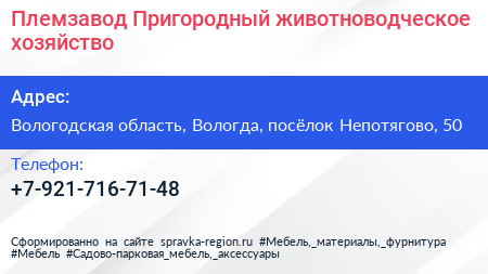 Племзавод Пригородный, животноводческое хозяйство по адресу Вологодская область, Вологда, посёлок Непотягово, 50 в дальнейшем Организация, размещена в следующих категориях:
