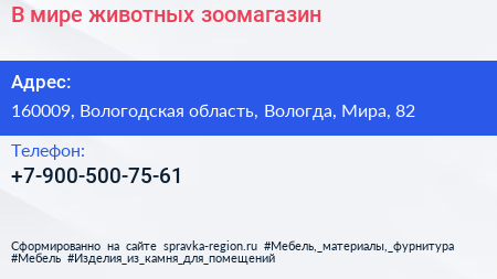 В мире животных, зоомагазин по адресу 160009, Вологодская область, Вологда, Мира, 82 в дальнейшем Организация, размещена в следующих категориях: