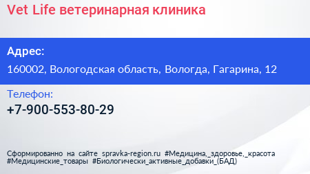 Vet Life, ветеринарная клиника по адресу 160002, Вологодская область, Вологда, Гагарина, 12 в дальнейшем Организация, размещена в следующих категориях: