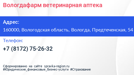 Вологдафарм, ветеринарная аптека по адресу 160000, Вологодская область, Вологда, Предтеченская, 54 в дальнейшем Организация, размещена в следующих категориях:
