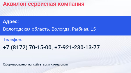 Аквилон, сервисная компания по адресу Вологодская область, Вологда, Рыбная, 15 в дальнейшем Организация, размещена в следующих категориях:
