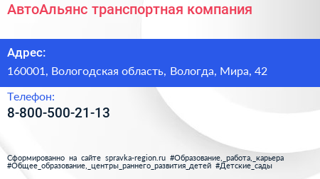 АвтоАльянс, транспортная компания по адресу 160001, Вологодская область, Вологда, Мира, 42 в дальнейшем Организация, размещена в следующих категориях: