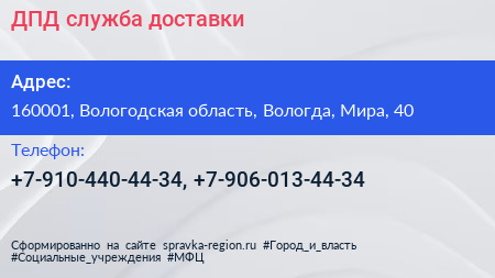 ДПД, служба доставки по адресу 160001, Вологодская область, Вологда, Мира, 40 в дальнейшем Организация, размещена в следующих категориях: